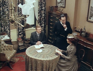 David Burke as Watson, Jeremy Brett as Holmes and Natasha Richardson as Violet Hunter in a screenshot from the 1985 Granada TV adaptation of "The Adventure of the Copper Beeches".